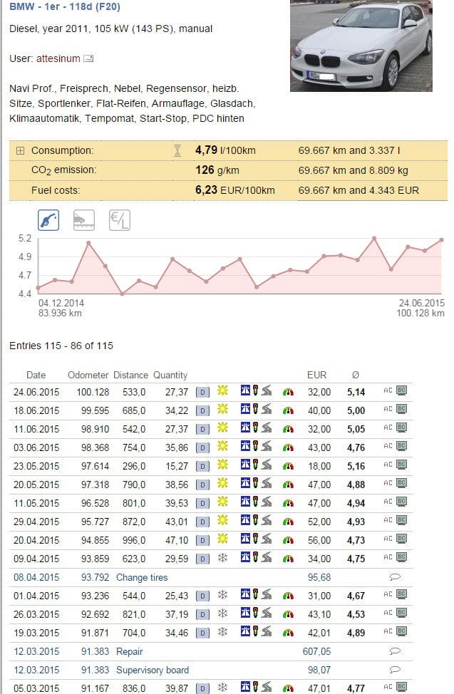 En ambas páginas, eligiendo el vehículo podemos ver el consumo y gastos de los usuarios de ese coche. En el caso de spritmonitor: