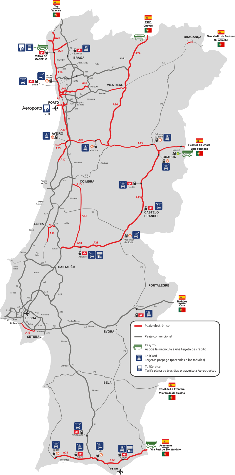 Tollservice: Hay dos tipos: Tarjeta prepago con tarifa plana por tres días o trayectos de España a los aeropuertos de Oporto o Faro. Sólo es válida para vehículos tipo 1 y 2 (como verás más abajo: coches, furgonetas y motos).